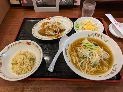 平日ランチ、ペルゴ王将ビエラ店トンカツがおかずで、半炒飯とゆで野菜トッピングラー・・・